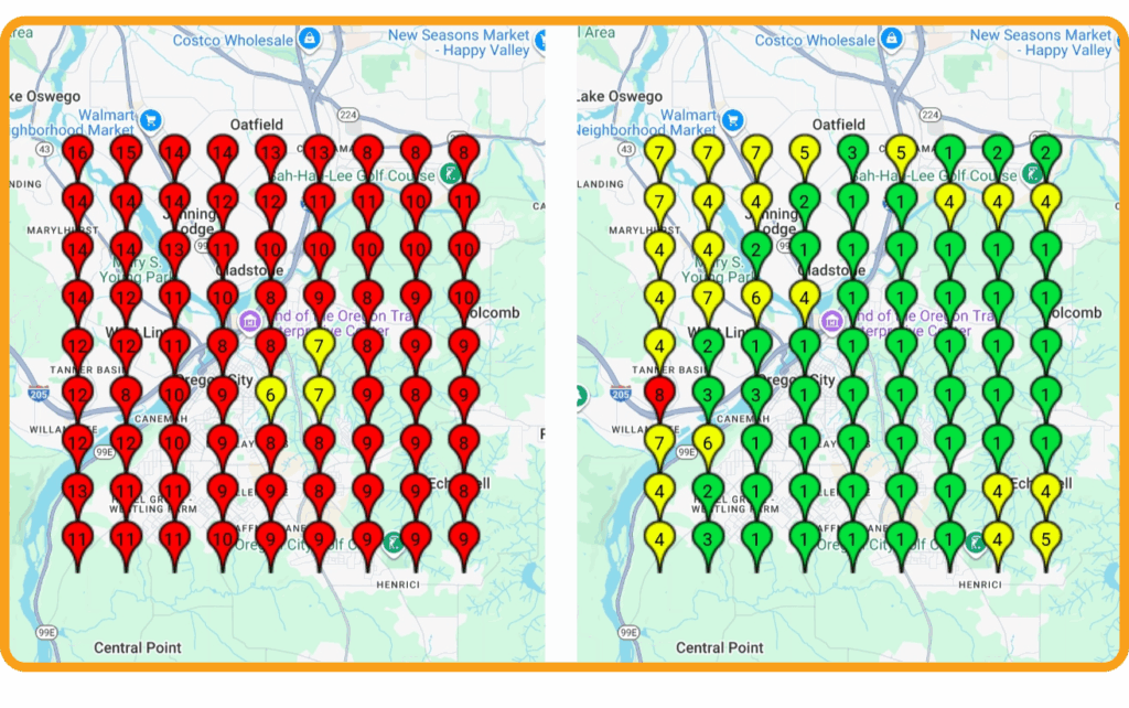 Methods: Keywords were divided into three groups (services‑only, products‑only, control). Average ranking positions were monitored across 7 dates using a 9×9 ranking grid covering a 3-mile radius, representing 49 individual points. Data was logged sequentially on March 10th, March 24th, April 7th, April 21st, May 5th, May 29th, and June 6th to measure performance trends over time.