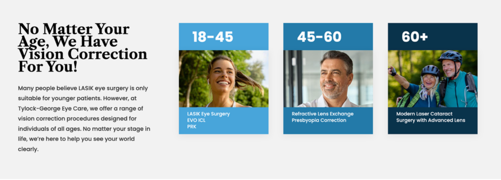 In developing the new website and messaging strategy for Tylock George Eye Care, we knew that listing procedures wasn’t enough. Patients don’t wake up thinking ‘I need RLE’ or ‘I want EVO ICL’, they wake up frustrated by glasses fogging up, struggling to see the scoreboard at their kid’s game, or worried about night driving safety.